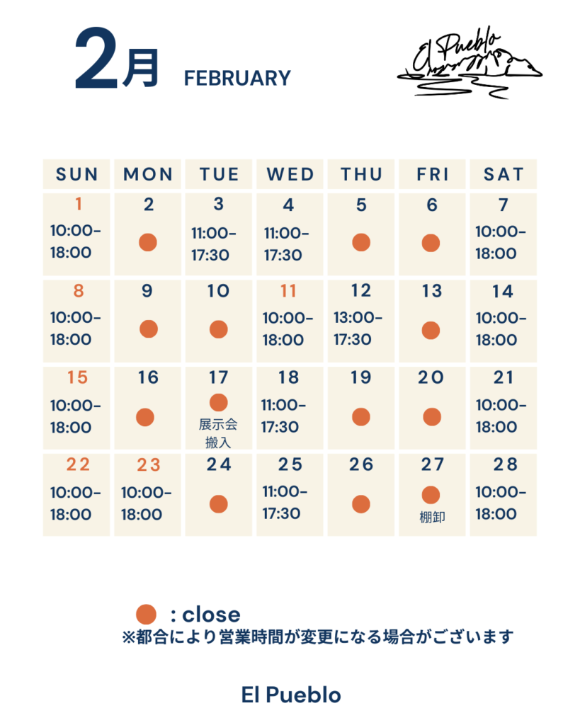 2月のエルプエブロ営業カレンダー